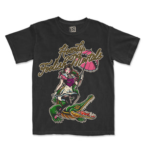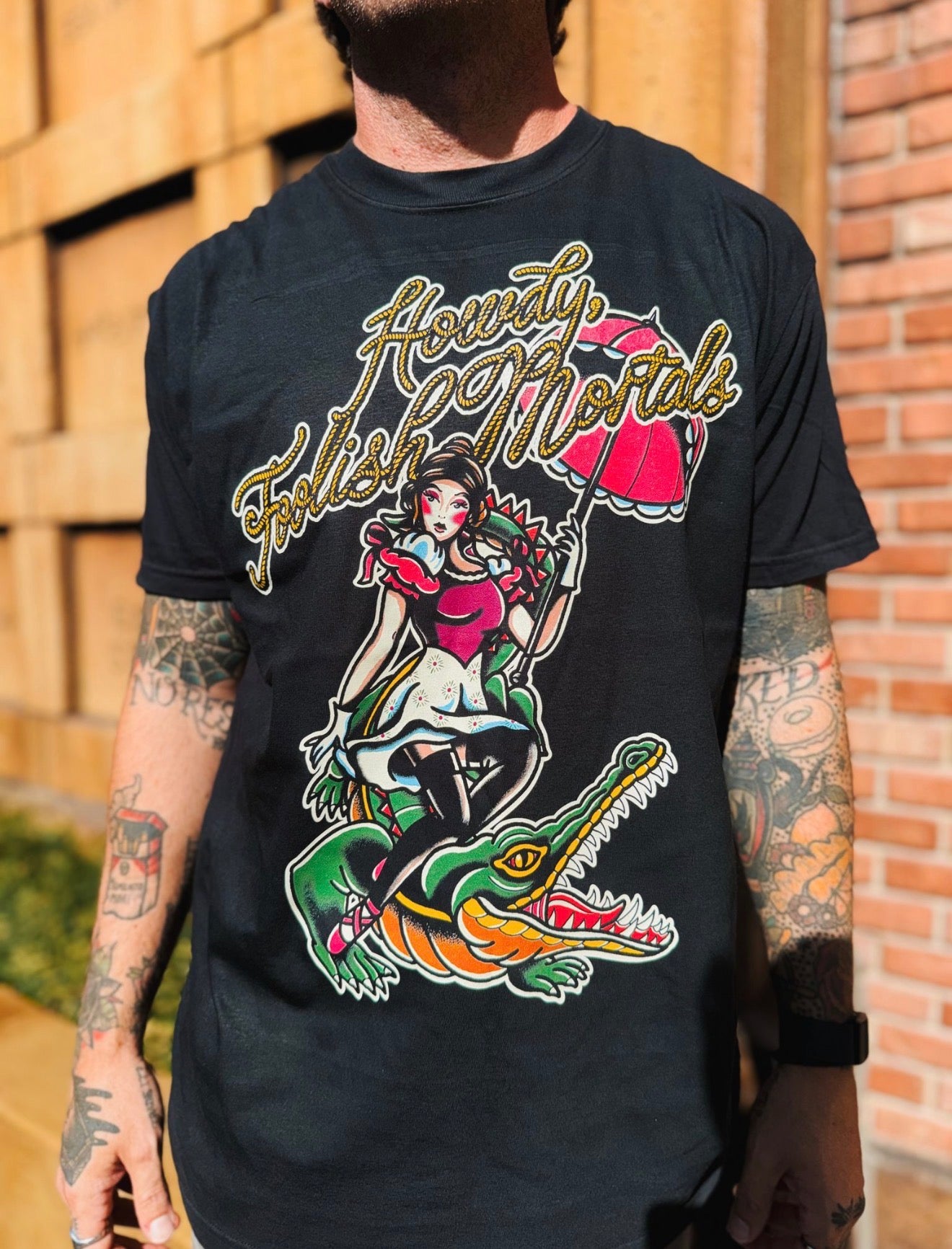 Step into the spirit realm in style with our bold Howdy Foolish Mortals Tee — featuring our favorite Sally, a gator with attitude, and just the right mix of spooky charm and tattoo flair!
