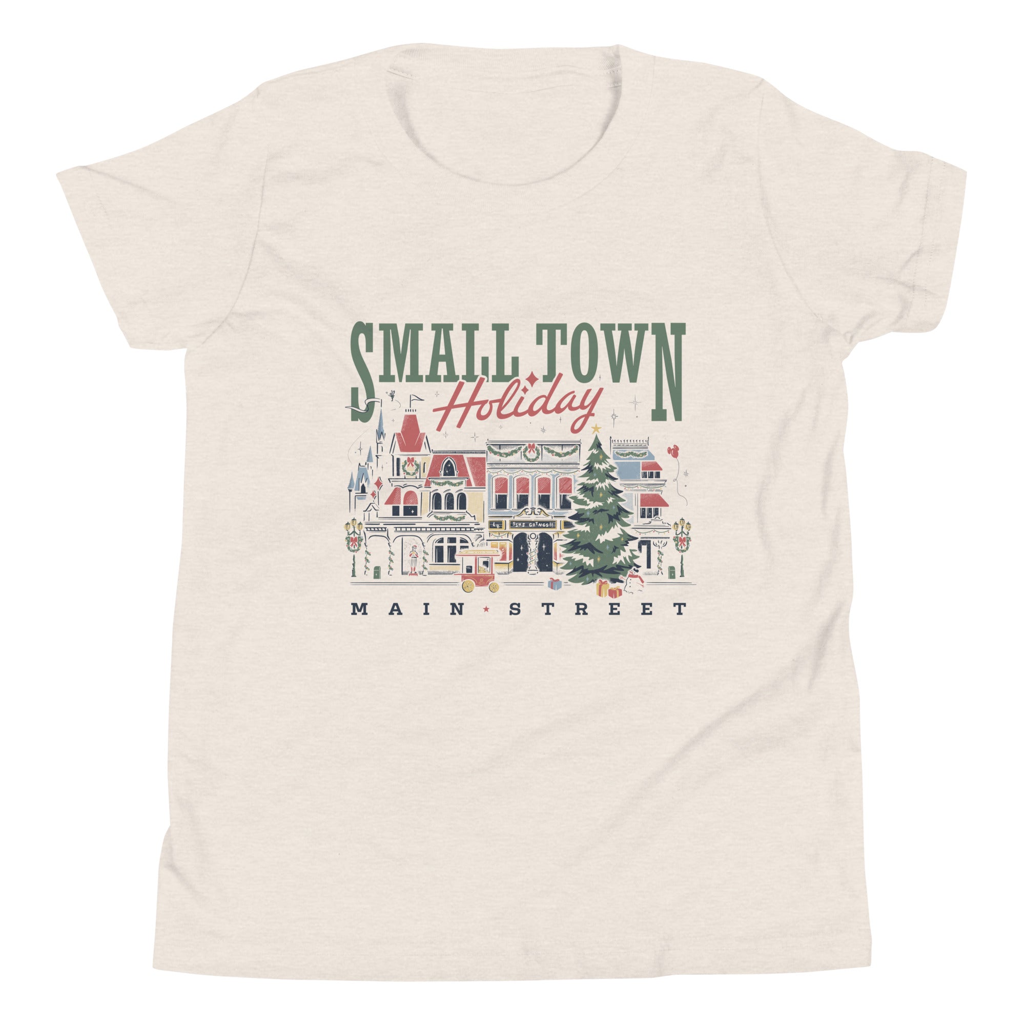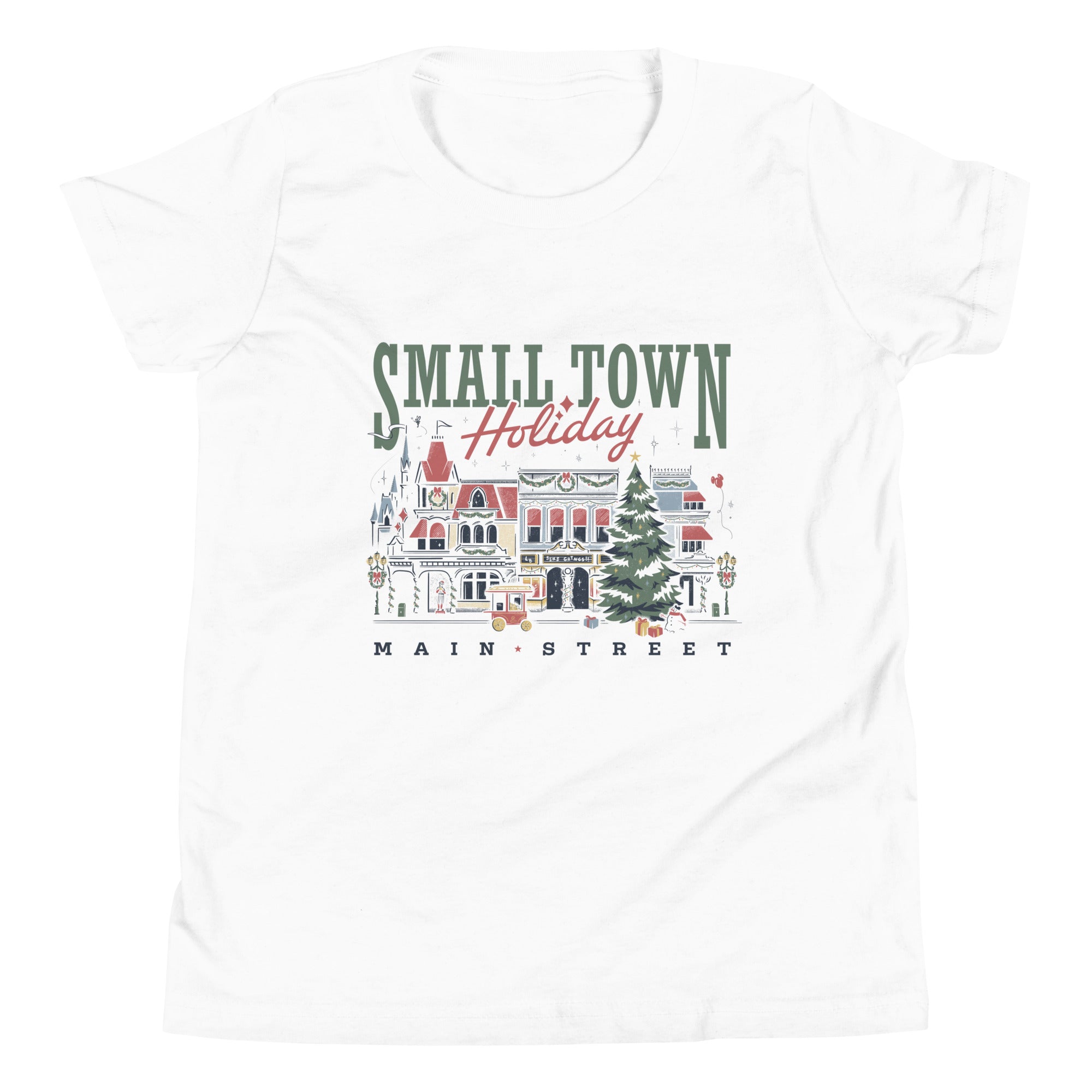 Celebrate the charm of small town holidays with this cozy youth tee, featuringthe festive streets of Main Street filled with lights, trees, and cheerful storefronts. Perfect for spreading seasonal cheer wherever you go!