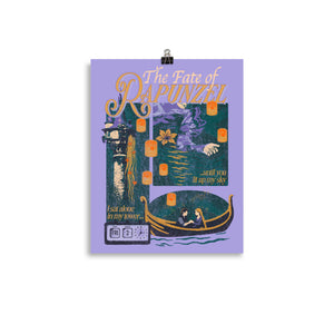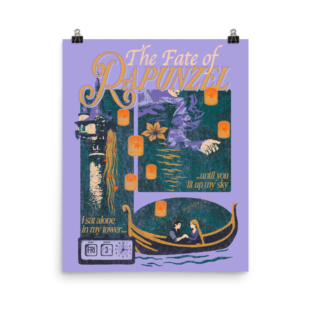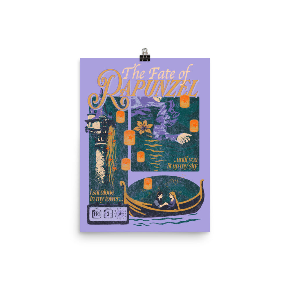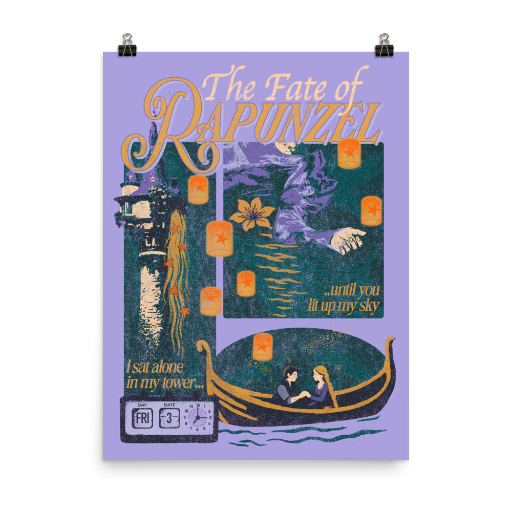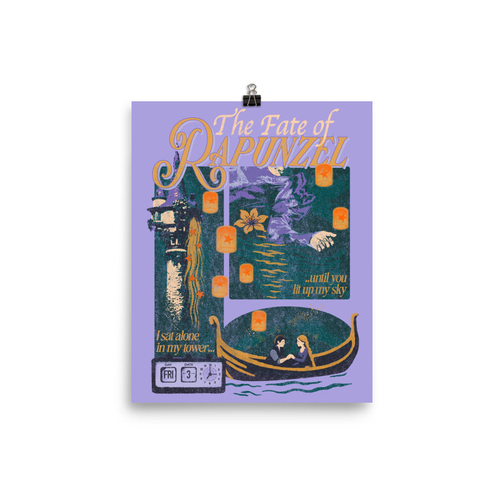 This dreamy The Fate of Rapunzel print captures the bittersweet journey of longing and connection, with a lonely tower, flickering lanterns, and a boat ride to a new horizon—perfect for those who believe in fate and love that changes everything.